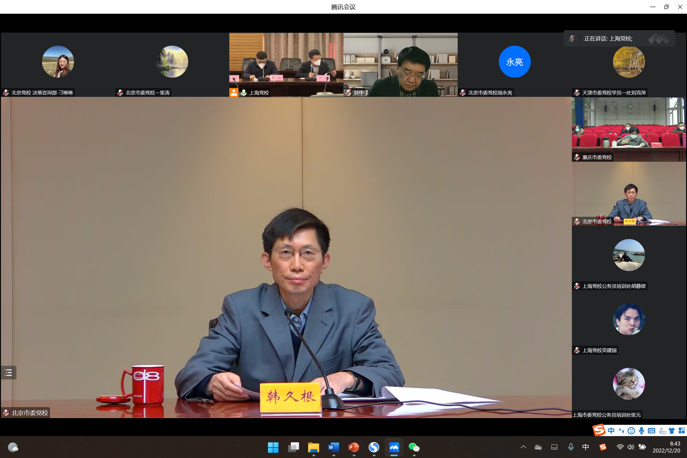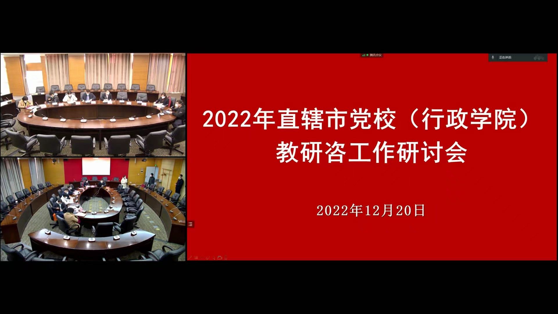 12月20日,由上海市委党校承办的2022年直辖市党校(行政学院)教研咨工作研讨会以线上形式顺利召开。上海市委党校(行政学院)常务副校(院)长徐建刚致开幕辞,副校(院)长曾峻主持会议。我校副校(院)长韩久根、天津市委党校(行政学院)副校(院)长徐中、重庆市委党校(行政学院)副校(院)长周学馨、上海市委党校(行政学院)教育长罗峰作大会交流发言。四个直辖市党校教务、科研、决策咨询、学员管理、培训等工作部门负责同志及有关人员共160余人线上参会。